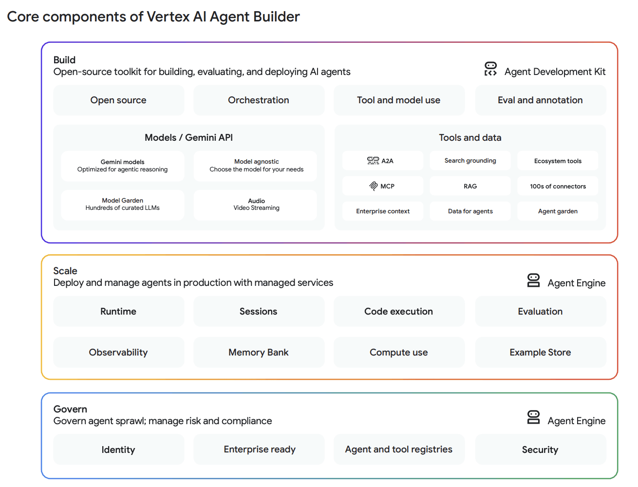 The build phase is the most intuitive. You pick a framework, choose a model, define tools, connect data sources, and get an agent doing something useful. Google's platform for this is Vertex AI Agent Builder, with the open-source Agent Development Kit (ADK) at its center.