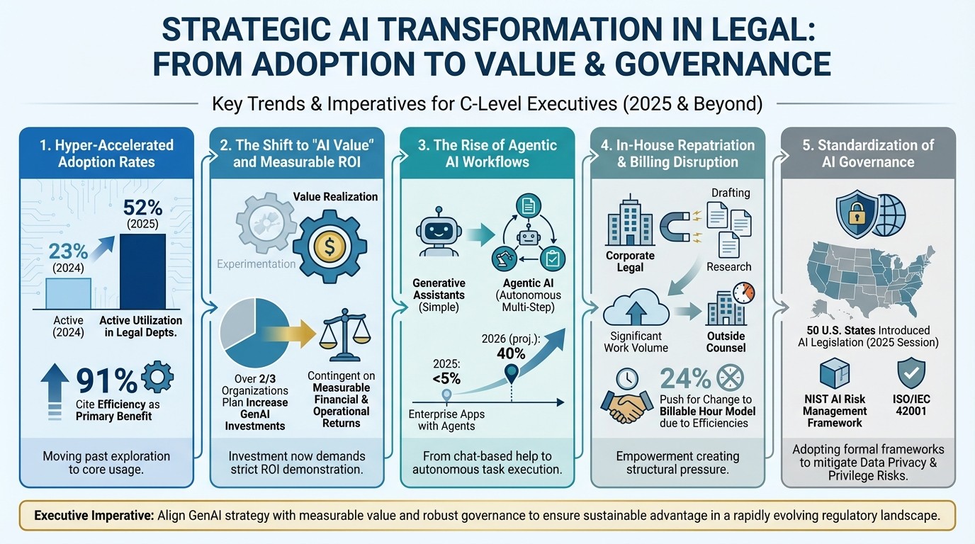 The enterprise legal sector is currently navigating several converging macro-trends regarding artificial intelligence. Based on recent market data and industry analysis, the following trends define the current landscape: